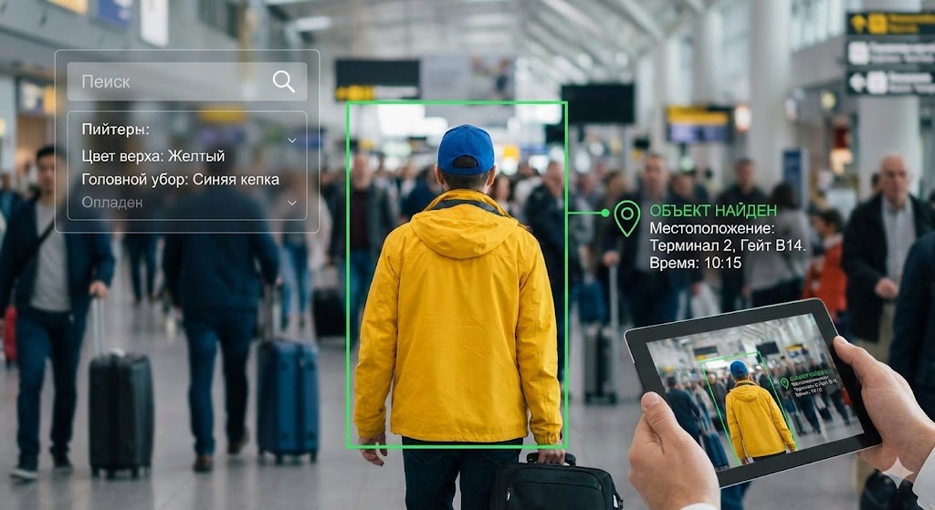 Поиск по типу объекта, цвету одежды, наличию сумки или очков.