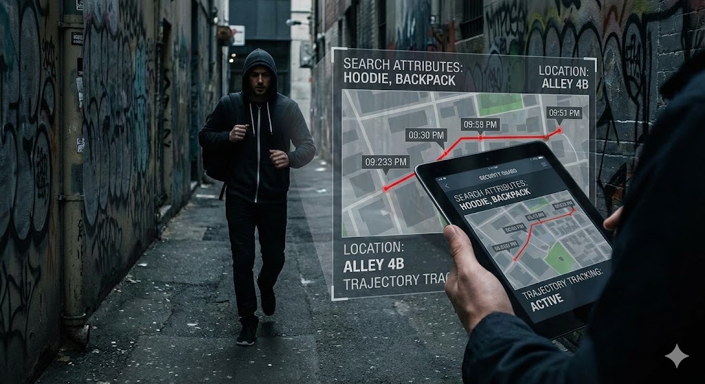 Поиск по атрибутам помогает быстро определить местонахождение объекта. Запрос на построение траектории перемещения позволяет немедленно найти грабителя и минимизировать ущерб.